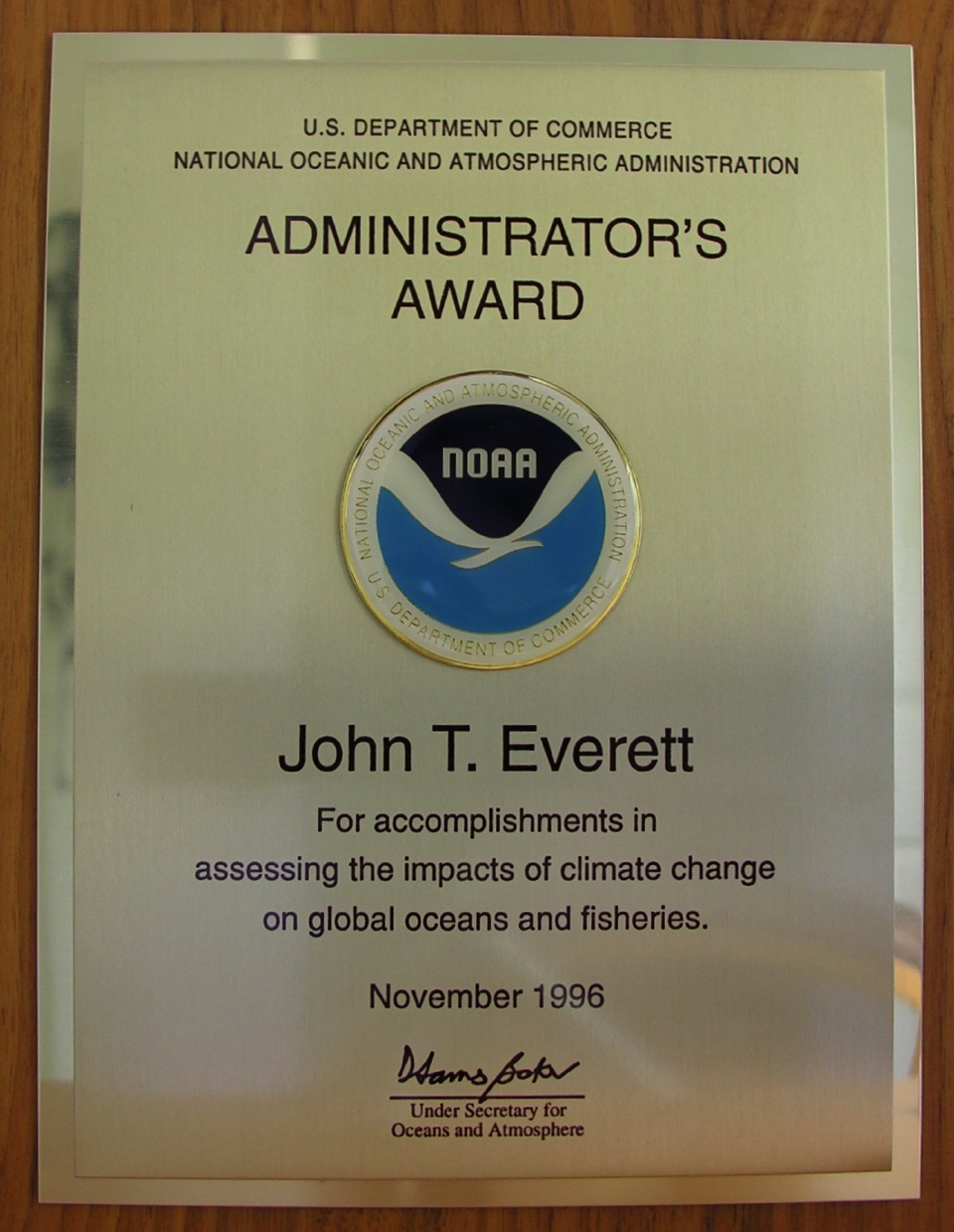 In 1996 he received the NOAA Administrator’s Award for “accomplishments in assessing the impacts of climate change on global oceans and fisheries.”